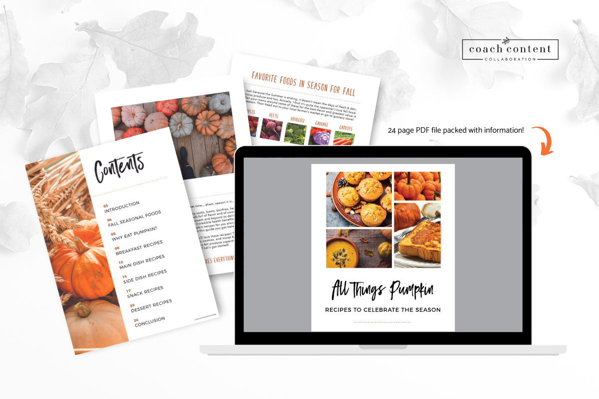 Calling all pumpkin lovers! This is a 24 page digital file that you can use as a freemium with email or client sign-up or even just as a great additional resource for your challenge groups. Provide more value for your clients and share your love of pumpkin with these healthy recipes!