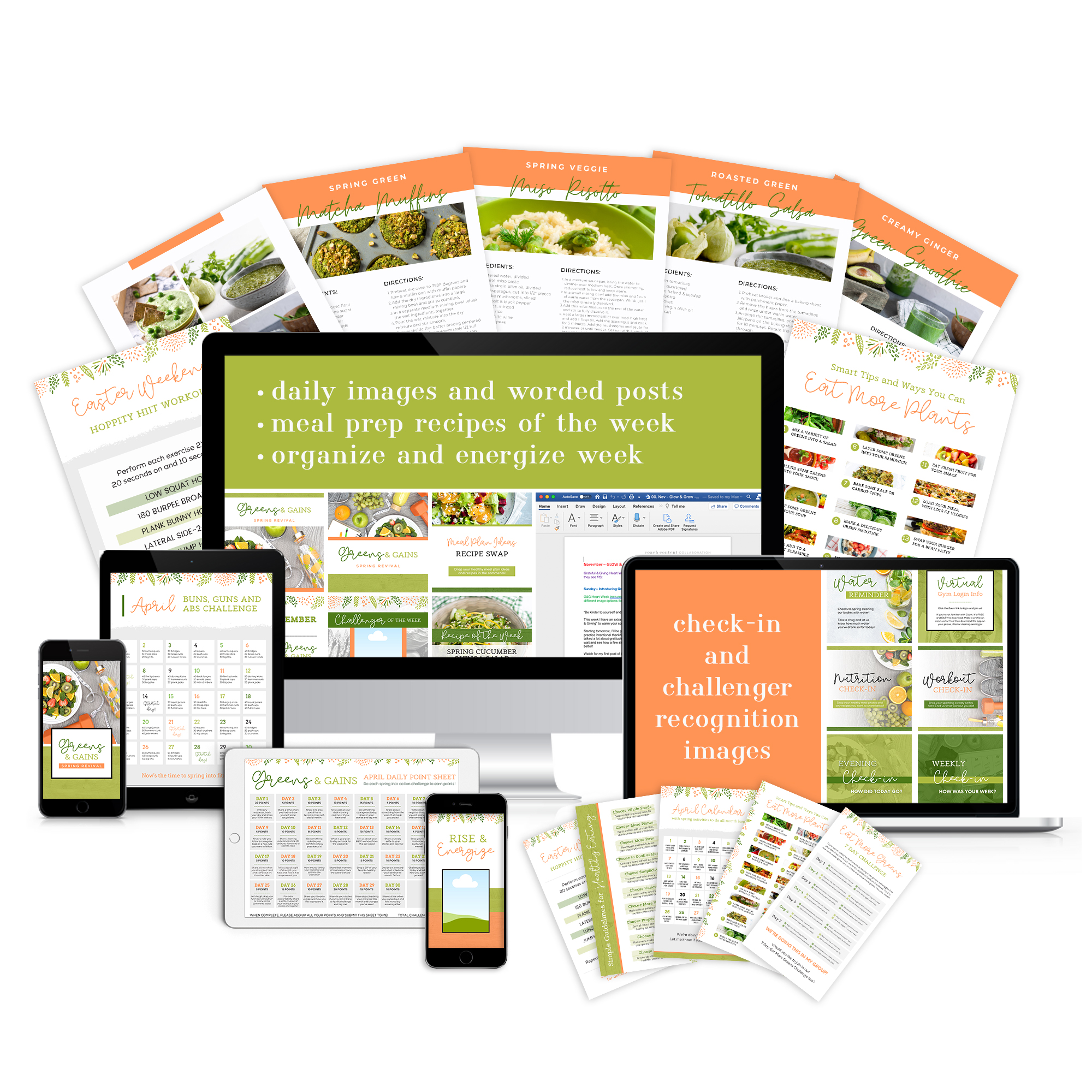 They say April showers bring May flowers! This April, help your challengers “shower” themselves with self-care while reviving their fitness and clearing any clutter for the beginning of a new season. Help them plant the seed for growth and sprout tall as they discover the power of positive thinking and confidence! With this month’s content, they’ll learn to “water” what’s important to GAIN momentum. You’ll show them how to sneak in more GREENS to earn those GAINS and revive their spirits with the fresh spring air!