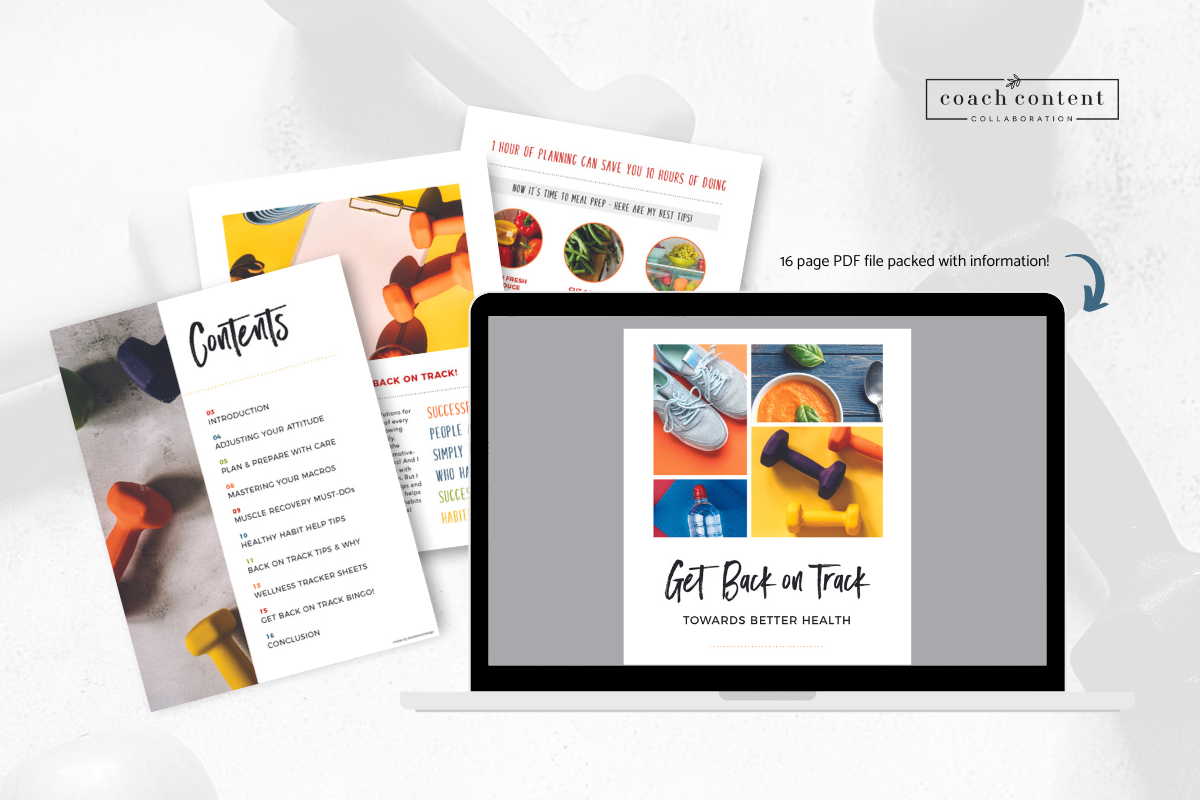 A digital file that you can use as a freemium with email or client sign-up or even just as a great additional resource for your challenge groups. This guide is great for helping your potential and future clients get back on track after they've lost momentum, motivation and discipline. Help them with tips to get back to healthy habits in no time!