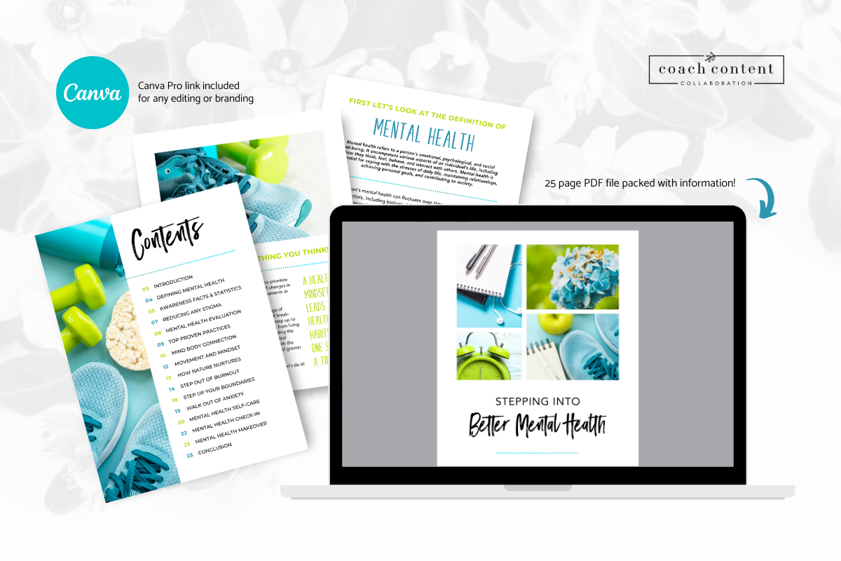 A digital file that you can use as a freemium with email or client sign-up or even just as a great additional resource for your challenge groups. This guide is great for helping your potential and future clients to learn more about mental health, why it matters, how to advocate for it, ways the mind & body are connected, how physical health affects it, how nature nurtures it, proven practices and self-care habits to improve mental health and so much more! This guide is a priceless resource packed with so much valuable information on a subject that is super important!.