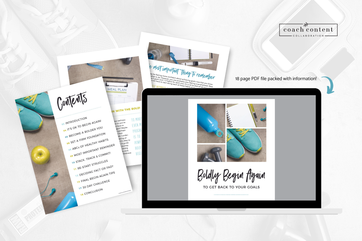 A digital file that you can use as a freemium with email or client sign-up or even just as a great additional resource for your challenge groups. This guide is great for helping your current or future clients with so many valuable tips on how to begin their wellness journey again, set firm habits, overcome struggles and be very bold!