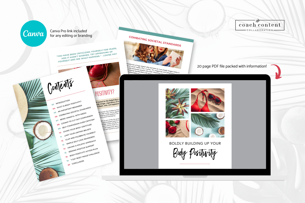 A digital file that you can use as a freemium with email or client sign-up or even just as a great additional resource for your challenge groups. This guide is great for helping your potential and future clients to learn more about body positivity, how to combat societal standards, being mindful of social media, cutting out comparison, giving gratitude to their body and so much more!