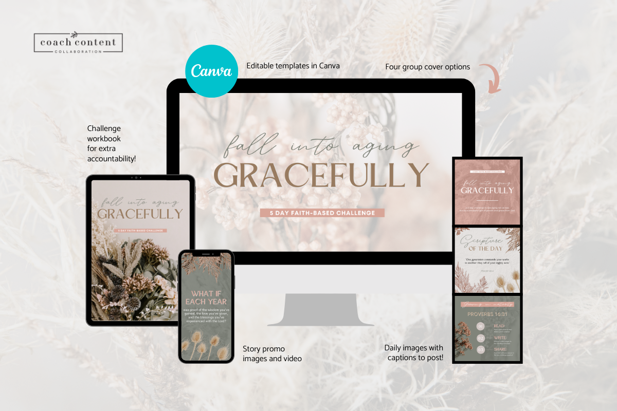 This 5-day done-for-you faith-based challenge group guide will help you and your clients embrace aging with grace, confidence, and joy in the Lord. Through daily scripture reflections, guided discussions, and practical mini challenges, participants will discover how to see aging not as something to fear, but as a season filled with wisdom, purpose, and God’s blessings. Each day unpacks a new biblical truth about growing older, offering encouragement, identity in Christ, and reminders of God’s faithfulness. It’s an easy-to-run, soul-strengthening challenge that will inspire women to honor God in every season of life and walk with confidence into the years ahead.