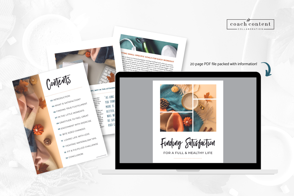 A digital file that you can use as a freemium with email or client sign-up or even just as a great additional resource for your challenge groups. This guide is great for helping your potential and future clients with tips on what satisfaction really is, how to find their own true fulfillment, being grateful to feel great, how to be satisfied in their workouts, nutrition, life's little moments and more!