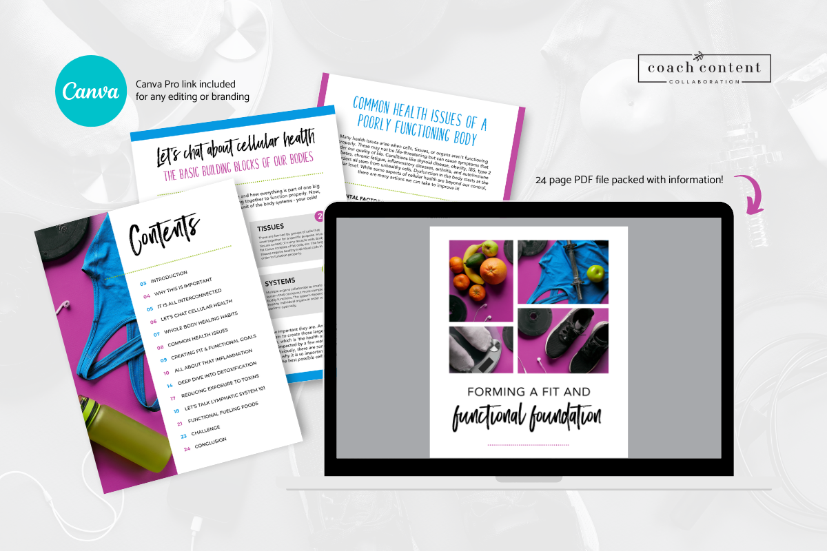 A digital file that you can use as a freemium with email or client sign-up or even just as a great additional resource for your challenge groups. This guide is great for helping your potential and future clients to learn more about how the body functions, why we should look at the body as a whole, healthy habits for healing, deep dive into detoxification, all about inflammation, stimulating the lymphatic system and so much more!