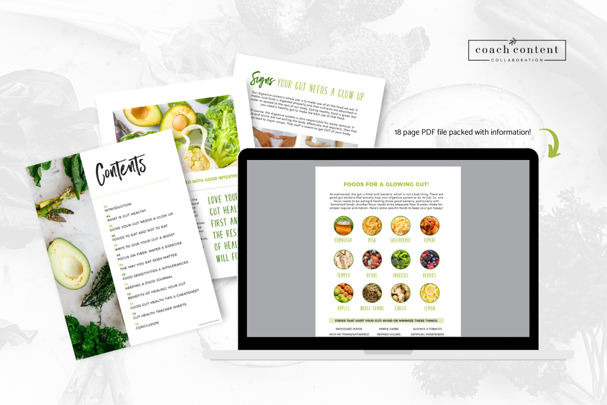 A digital file that you can use as a freemium with email or client sign-up or even just as a great additional resource for your challenge groups. This guide is great for helping your potential and future clients with tips on how to heal their gut so they can glow from the inside out!