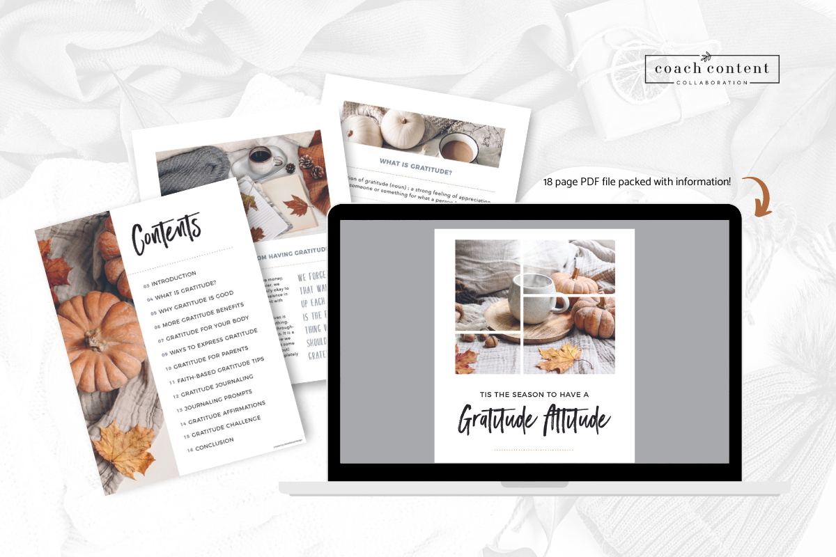 A digital file that you can use as a freemium with email or client sign-up or even just as a great additional resource for your challenge groups. This guide is great for helping your potential and future clients to understand the priceless benefits of making gratitude a daily habit! It has what gratitude is, the benefits, showing your body gratitude, faith-based gratitude, journaling prompts, gratitude affirmations and more! This has FAITH-BASED blurbs.