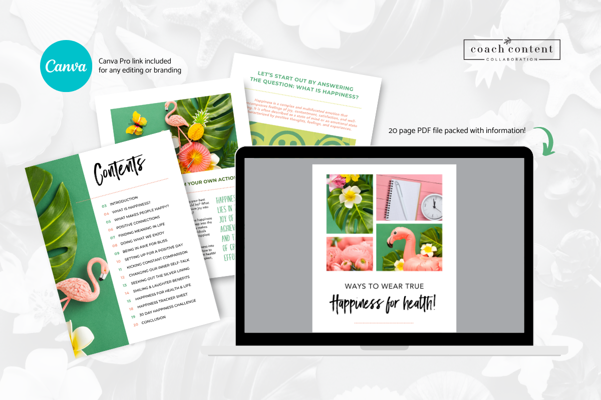 A digital file that you can use as a freemium with email or client sign-up or even just as a great additional resource for your challenge groups. This guide is great for helping your potential and future clients to learn more about what happiness is, what makes people happy according to research, how to create positive connections, finding meaning in life, doing what we really enjoy, setting up for a positive day and so much more!