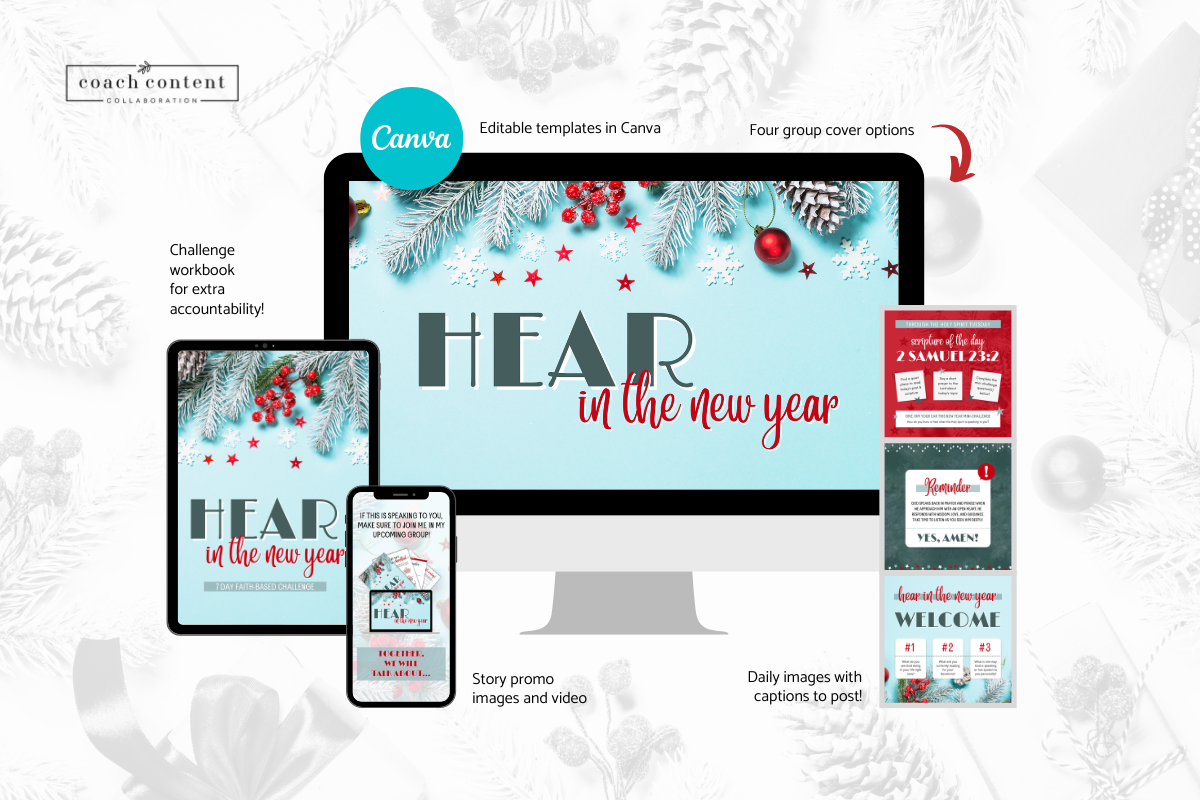 With this 7 day done-for-you faith-based challenge group guide will help you and your clients learn the different ways God speaks to us, why we should try fasting, being aware of those around us, how to listen if we struggle to pray and so much more!
