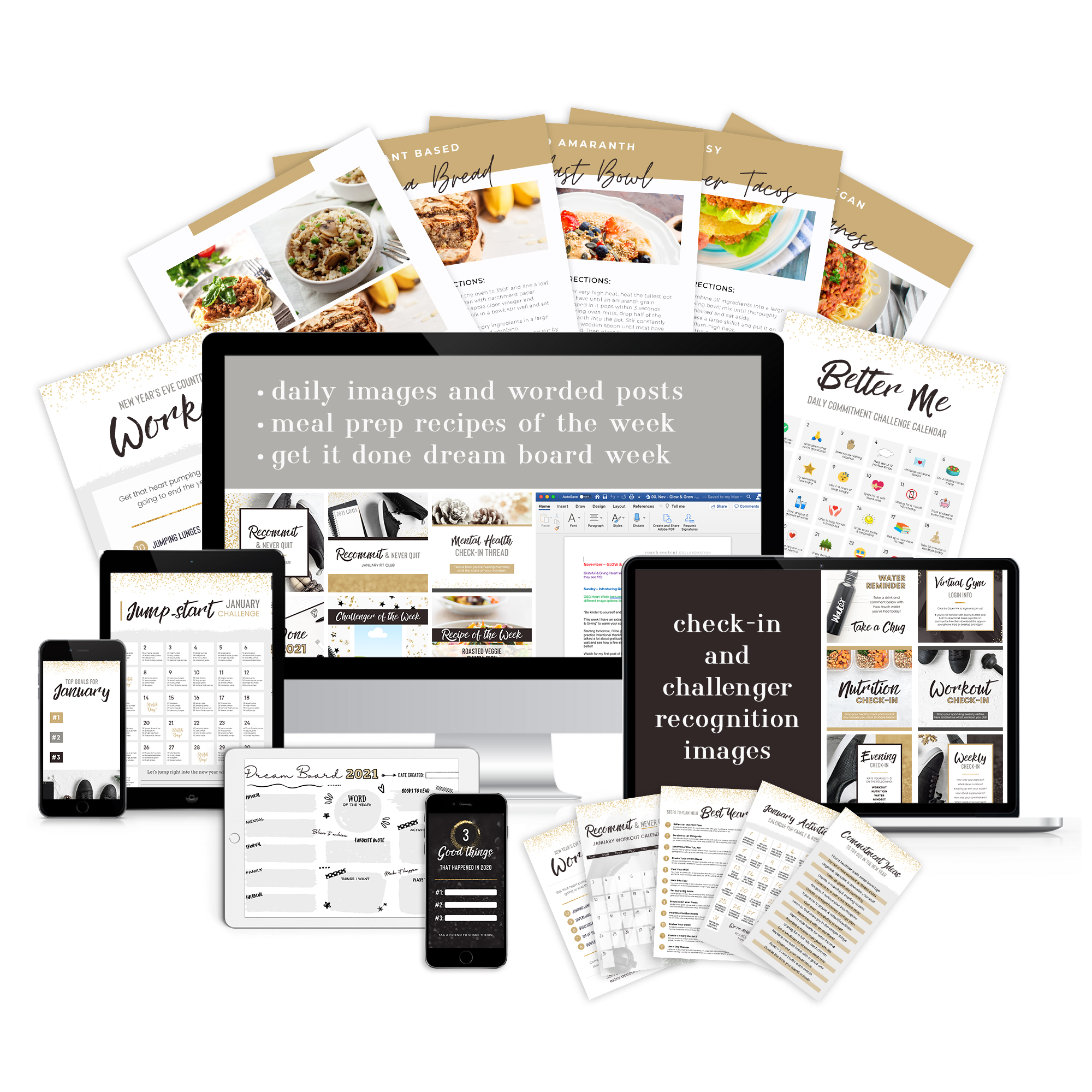 Ready to say HELLO to 2021 and GOOD-BYE to 2020?! Ready for a brand-new year and a fresh clean slate?! Help you and your clients recommit to their health & fitness as you take control of your own happiness & fulfillment. Celebrate 2021 in a BIG way with this New Year's group content. Topics include, finding the best version of you, creating a new positive mindset, goal creation & taking action, accountability, dream board creation and setting up for long-term success.