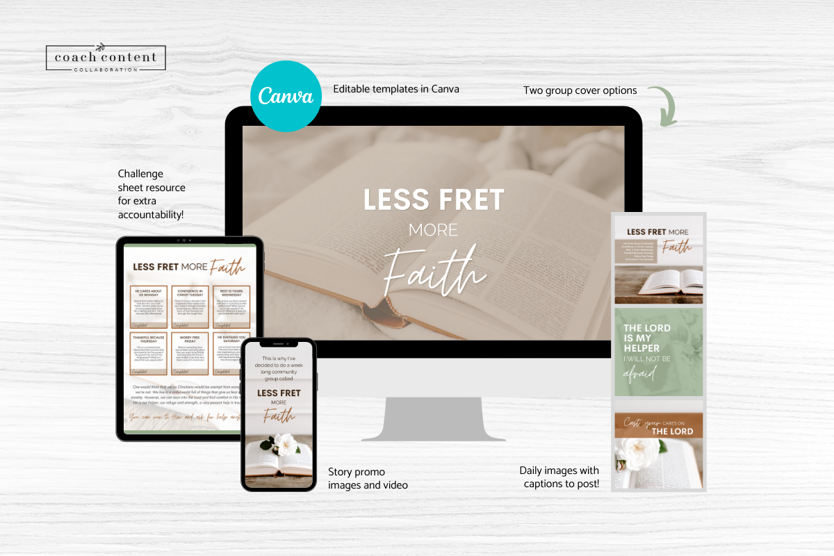 Would you like to help yourself and your challengers experience less fret and increase in faith? Here's the week for you! Lean into God, trust that He is in charge of your life and release control over to Him. This 6 day group has a daily Bible verse, faith-based encouragement and mini-challenges designed to help grow your faith and your relationship with Him. There are daily caption posts, daily images, cover images, story invite images and challenge card image.