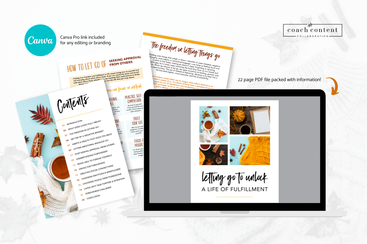 A digital file that you can use as a freemium with email or client sign-up or even just as a great additional resource for your challenge groups. This guide is great for helping your potential and future clients to learn more about how to live more fully in life, the things they need to let go that are holding them back, what forgiveness really looks like, ways to boost happiness & wellbeing and so much more!