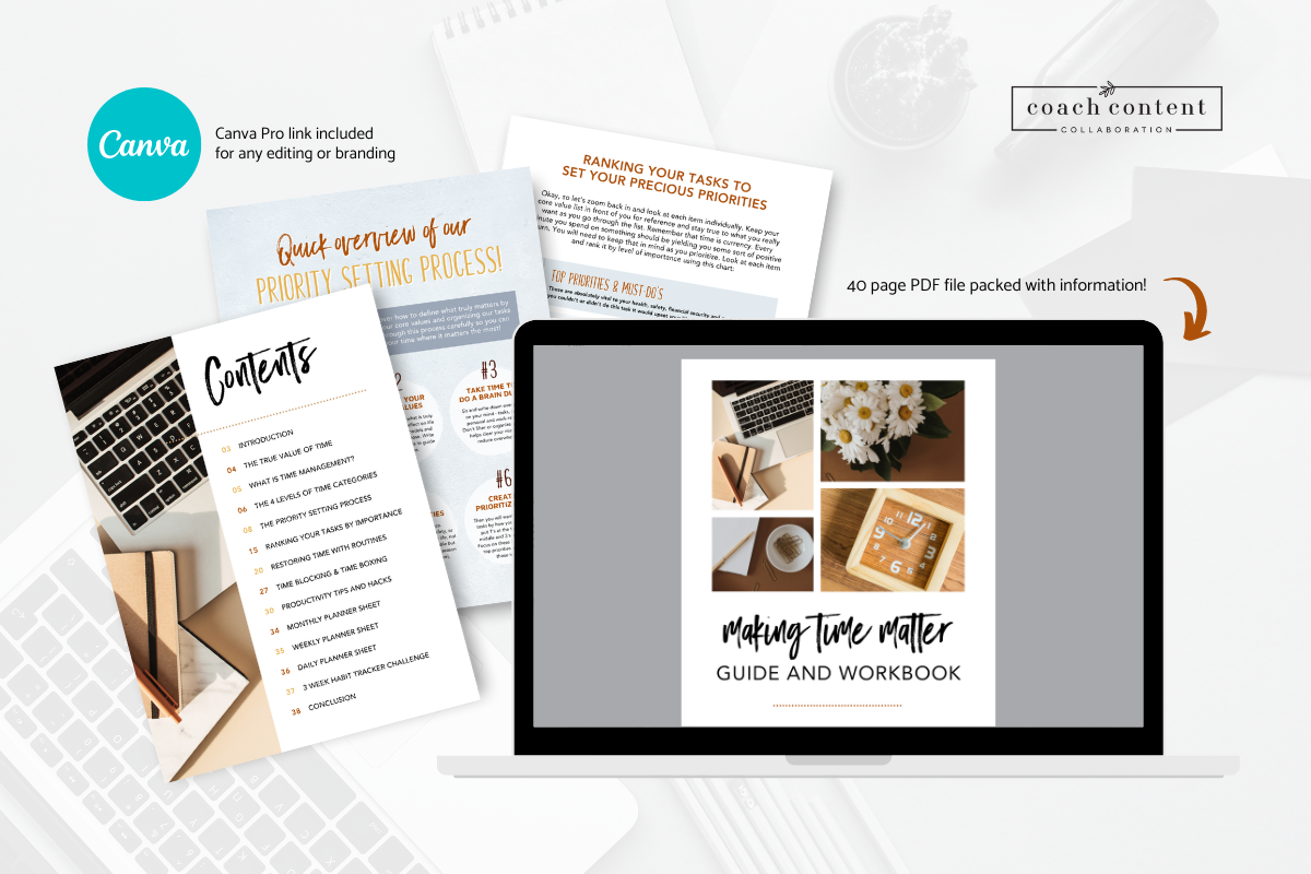 A digital file that you can use as a freemium with email or client sign-up or even just as a great additional resource for your challenge groups. This guide is great for helping your potential and future clients to learn more about the true value of time, how to categorize how they are spending their time, going through the priority setting process, restoring their time with routine systems, creating habits and so much more!