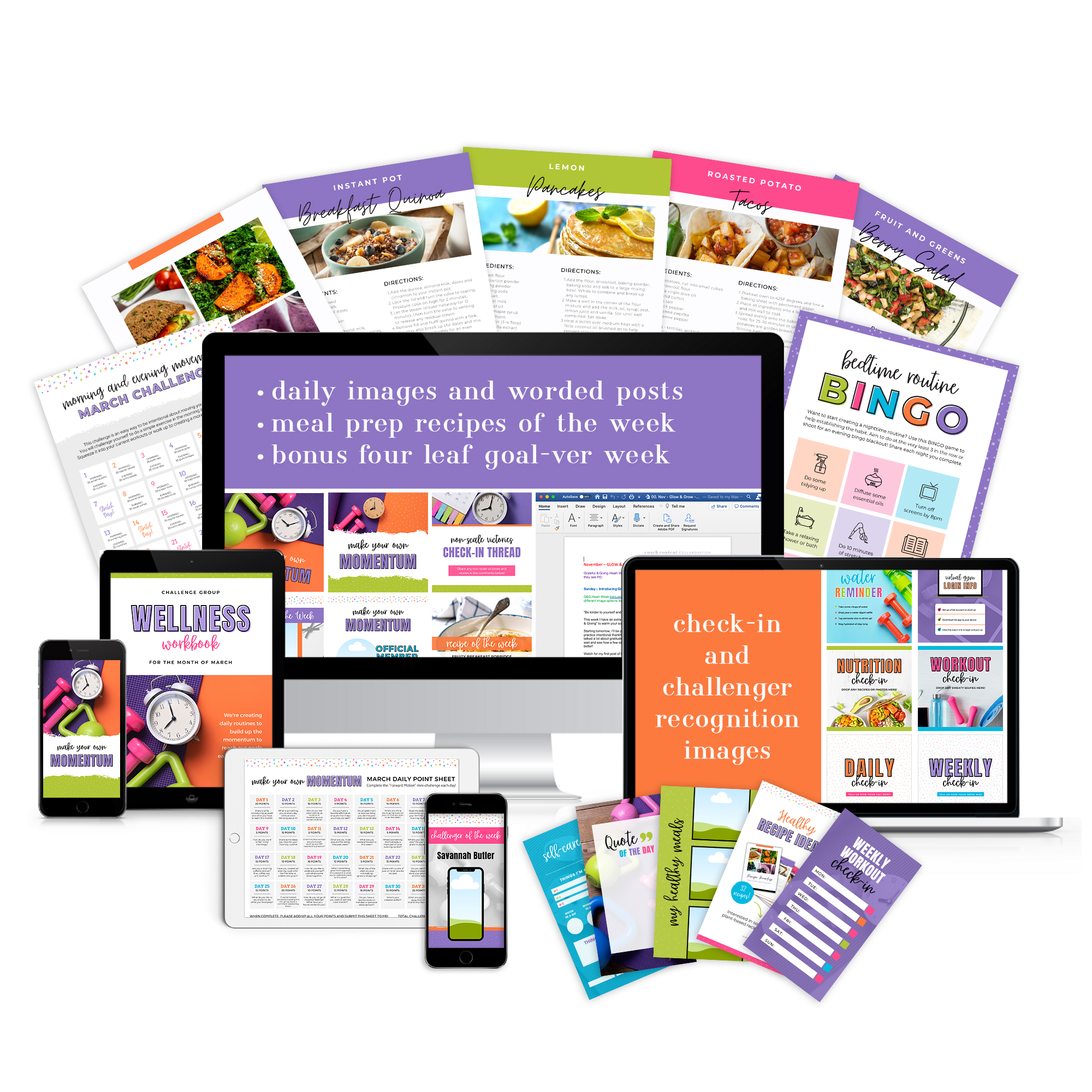 WE LOVE creating more time and space for health and fitness coaches! We provide daily content to post, images created in Canva that you can customize to your own branding, workbooks and trackers so your group can stay on track, recipes, calendars, and so much more! Our hope is that by using our content, you can spend more time supporting your clients, finding new customers, and loving your life! Let us do the heavy lifting so you can spend more time with your people!