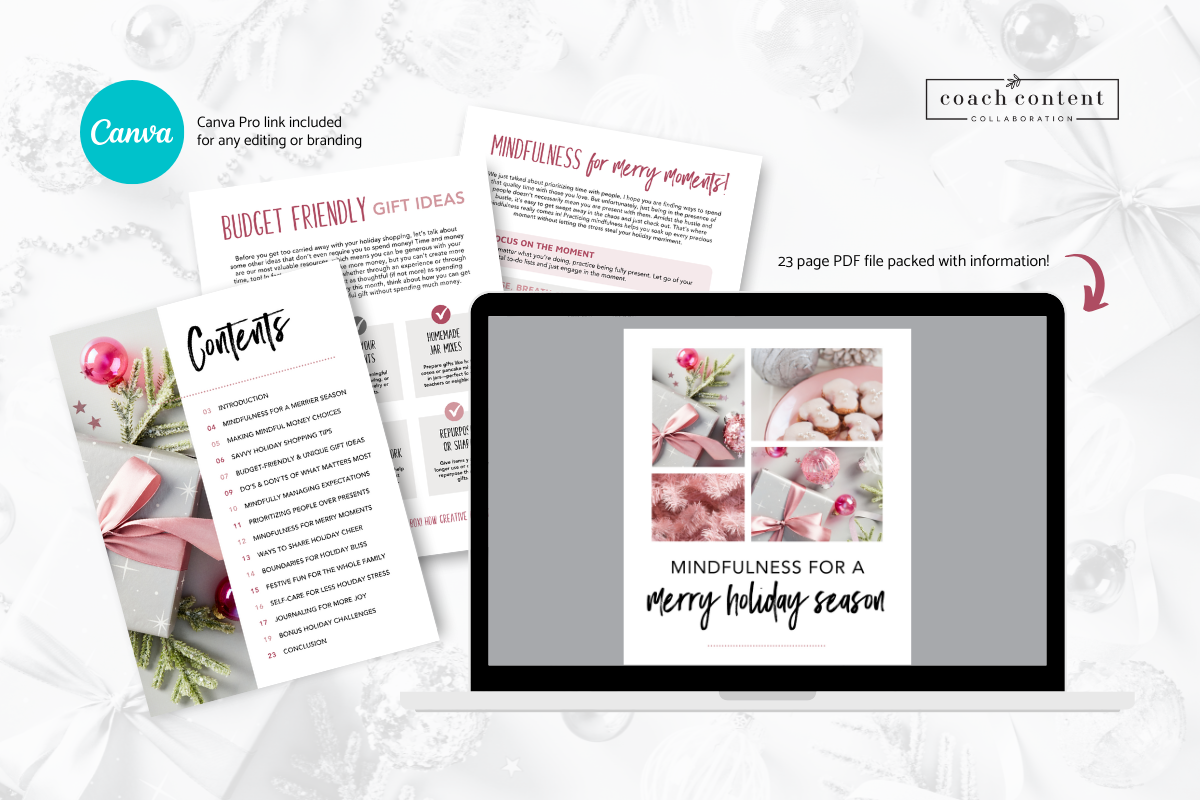 A digital file that you can use as a freemium with email or client sign-up or even just as a great additional resource for your challenge groups. This guide is great for helping your potential and future clients to feel more connected, peaceful, and joyful—creating holiday memories that last for all the right reasons. Here’s to a season filled with mindfulness, meaning, and merriment!