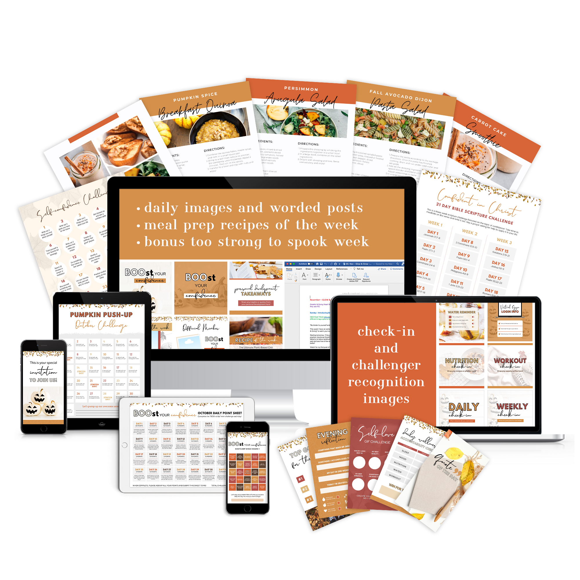 It’s time to BOOst Your Confidnece in October! It’ll scare you just how fast your self-confidence rises this month! We’ll be focusing on overcoming our fears, how to treat ourselves, stepping out as our most authentic self, and crushing a big goal for the month! We’ll get stronger physically, mentally, and emotionally, all while learning to love ourselves on a deeper level. Content focuses on radical self-acceptance, getting fit, becoming fearless, being healthy, goal setting, and supporting one another! If your community needs a confidence boost, this is the month for them!