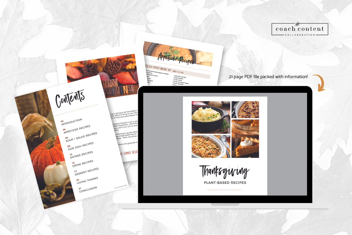Healthy whole food plant-based Thanksgiving Recipes Guide! There will be a few recipes for each of the following categories: appetizers, soups, salads, side dishes, entrees, drinks and dessert. This is a 21 page digital file that you can use as a freemium with email or client sign-up or even just as a great additional resource for your challenge groups. Provide more value for your clients and share your love of Thanksgiving with these healthy recipes!