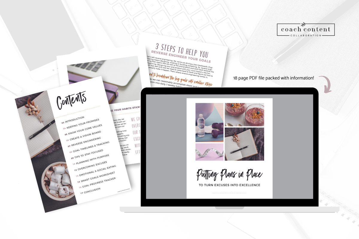 A digital file that you can use as a freemium with email or client sign-up or even just as a great additional resource for your challenge groups. This guide is great for helping your potential and future clients with tips on how they can keep their goal promises to themselves! Putting plans and overcoming excuses & obstacles is key!