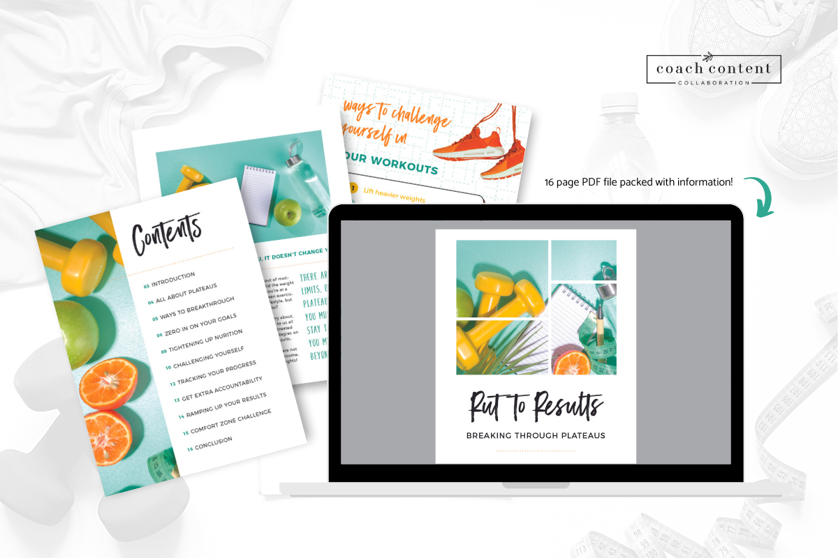 A digital file that you can use as a freemium with email or client sign-up or even just as a great additional resource for your challenge groups. This guide is great for helping your potential and future clients break through any fitness plateaus they are experiencing by re-evaluating their workouts, nutrition and routine.
