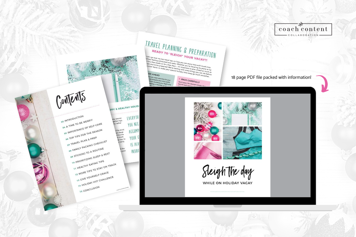 A digital file that you can use as a freemium with email or client sign-up or even just as a great additional resource for your challenge groups. This guide is great for helping your potential and future clients with tips to include self-care during the most wonderful time of the year and how to plan ahead and stay on track when traveling over the holidays!
