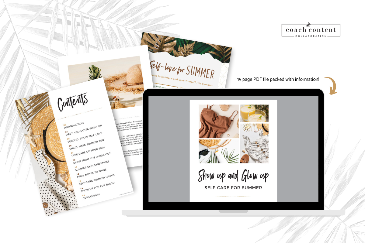 A digital file that you can use as a freemium with email or client sign-up or even just as a great additional resource for your challenge groups. This guide is great for helping your potential and future clients be able to show up for themselves this summer! Simple self-care and skincare tips to help them shine brighter than the summer sun.