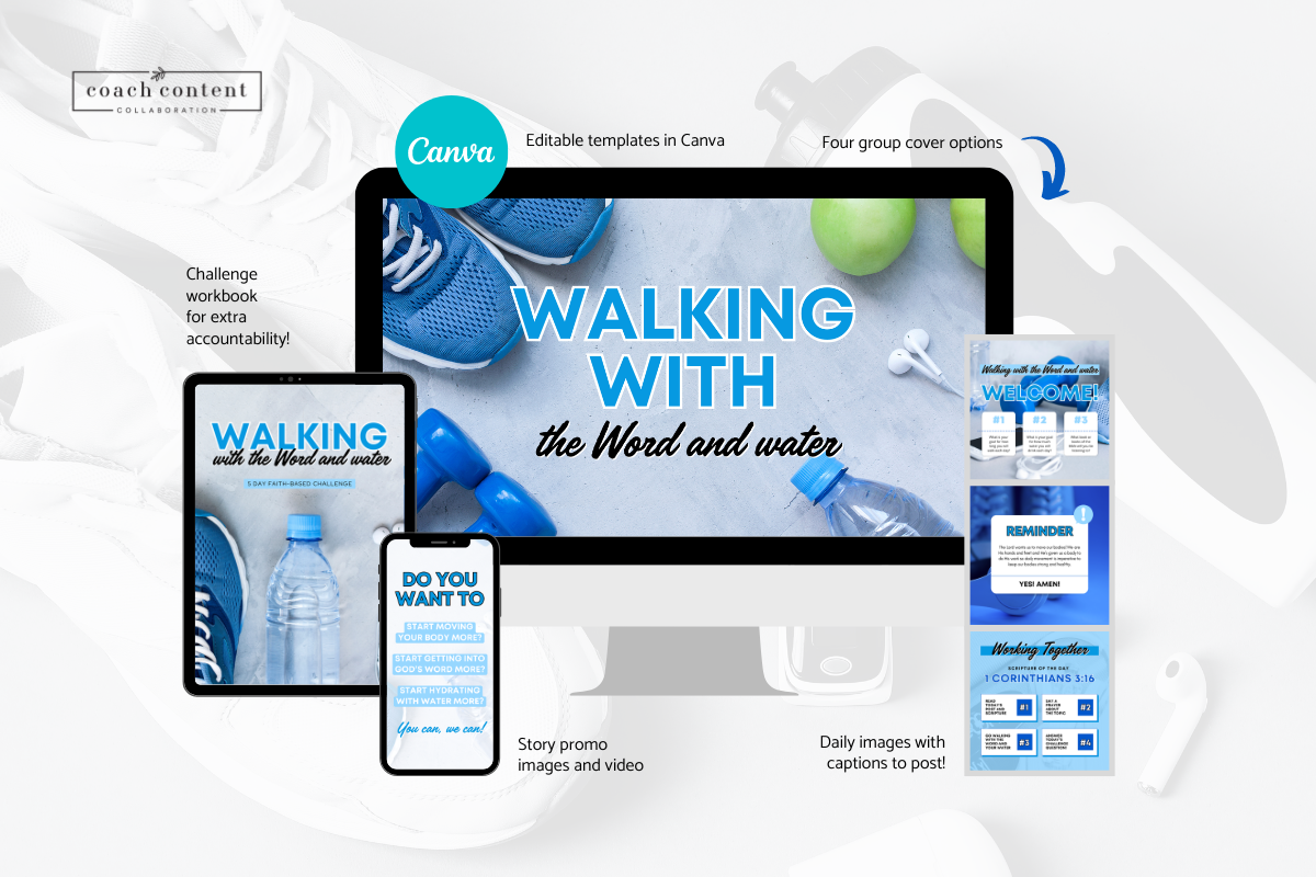 With this 5 day done-for-you faith-based challenge group guide will help you and your clients to get up and take a walk each day while listening to the Word and drinking your water. You'll talk about why we were made to move, the importance of water, reminders of why we need to read the Word and so much more!